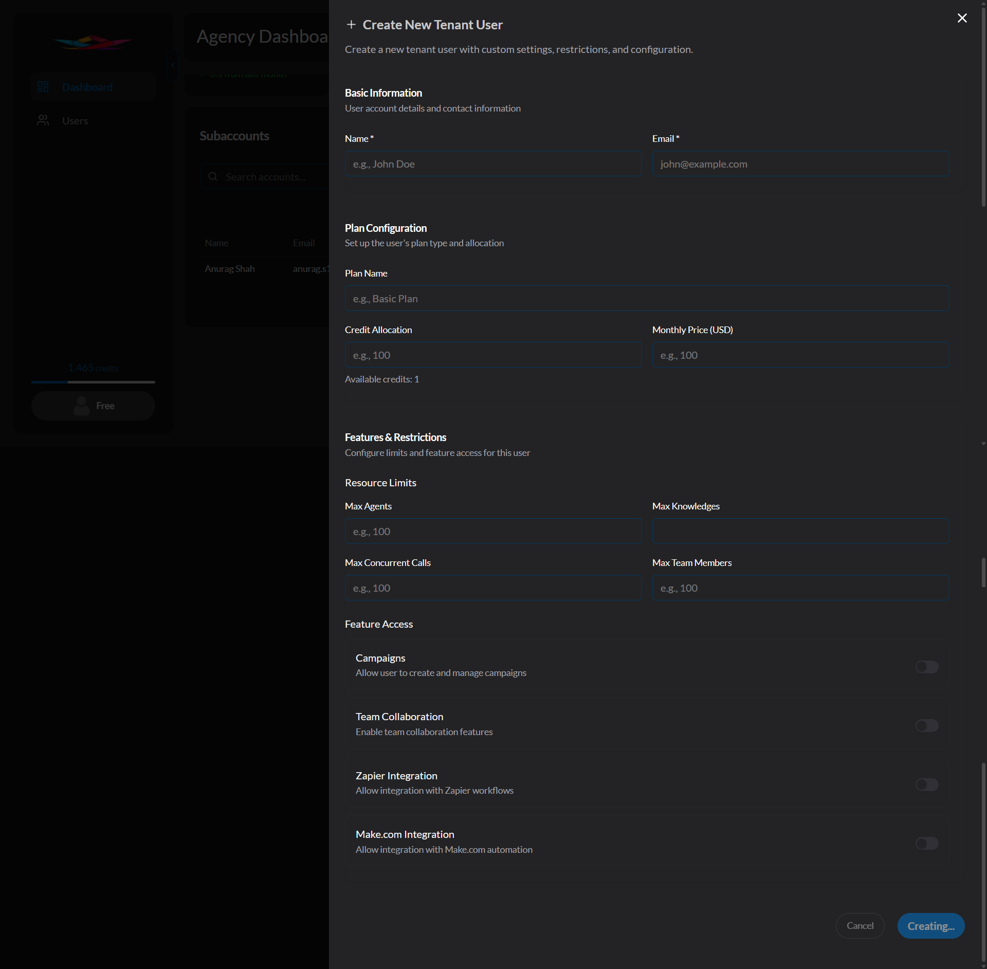 - While creating a sub-account, you can set custom plan names, allocate credits, and decide pricing.