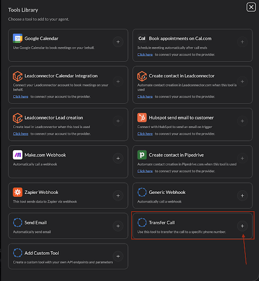 Sometimes your AI voice agent may need to hand off the call to a human, especially during escalations or complex queries. Here’s how to set that up: