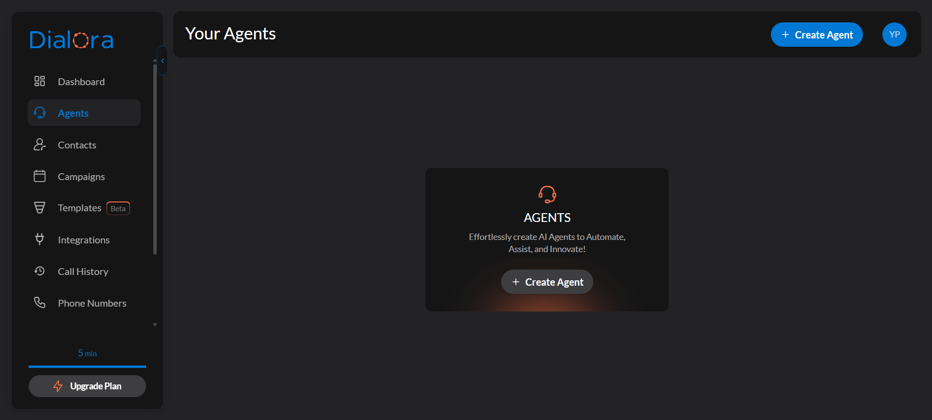 On the left-hand menu of the dashboard, you’ll notice various options such as Workflows, Campaigns, Call History, etc. To create your voice agent, simply click on the Create Agent button.