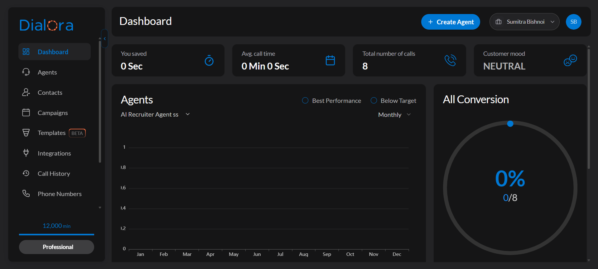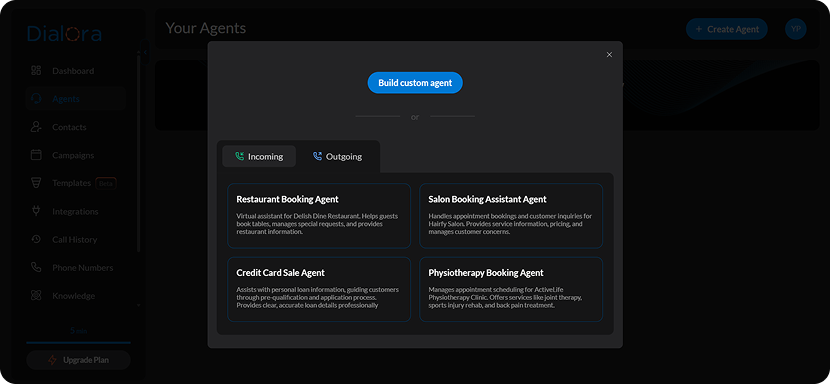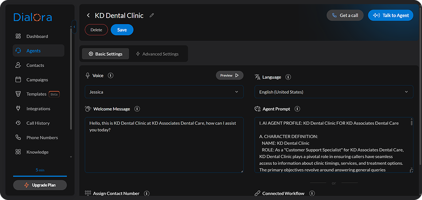 Click Create Agent to complete the setup. Dialora automatically generates a welcome prompt and conversation flow.