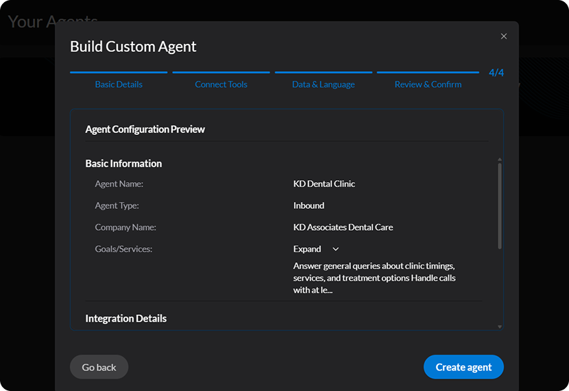 - Build a fully customized voice agent based on your unique business needs.