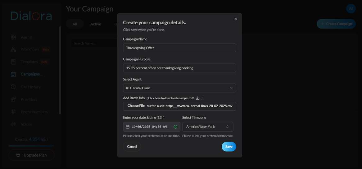 Follow these steps to launch an outbound voice campaign using your AI agent inside Dialora , perfect for offers, appointment reminders, or any customer outreach automation.