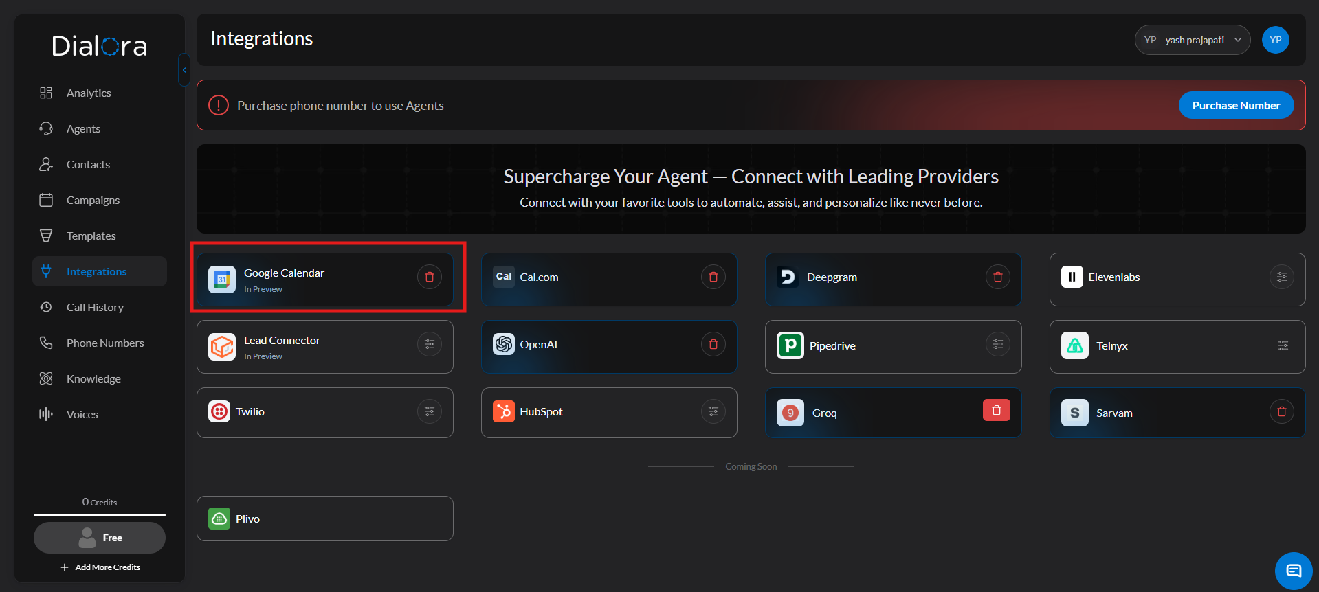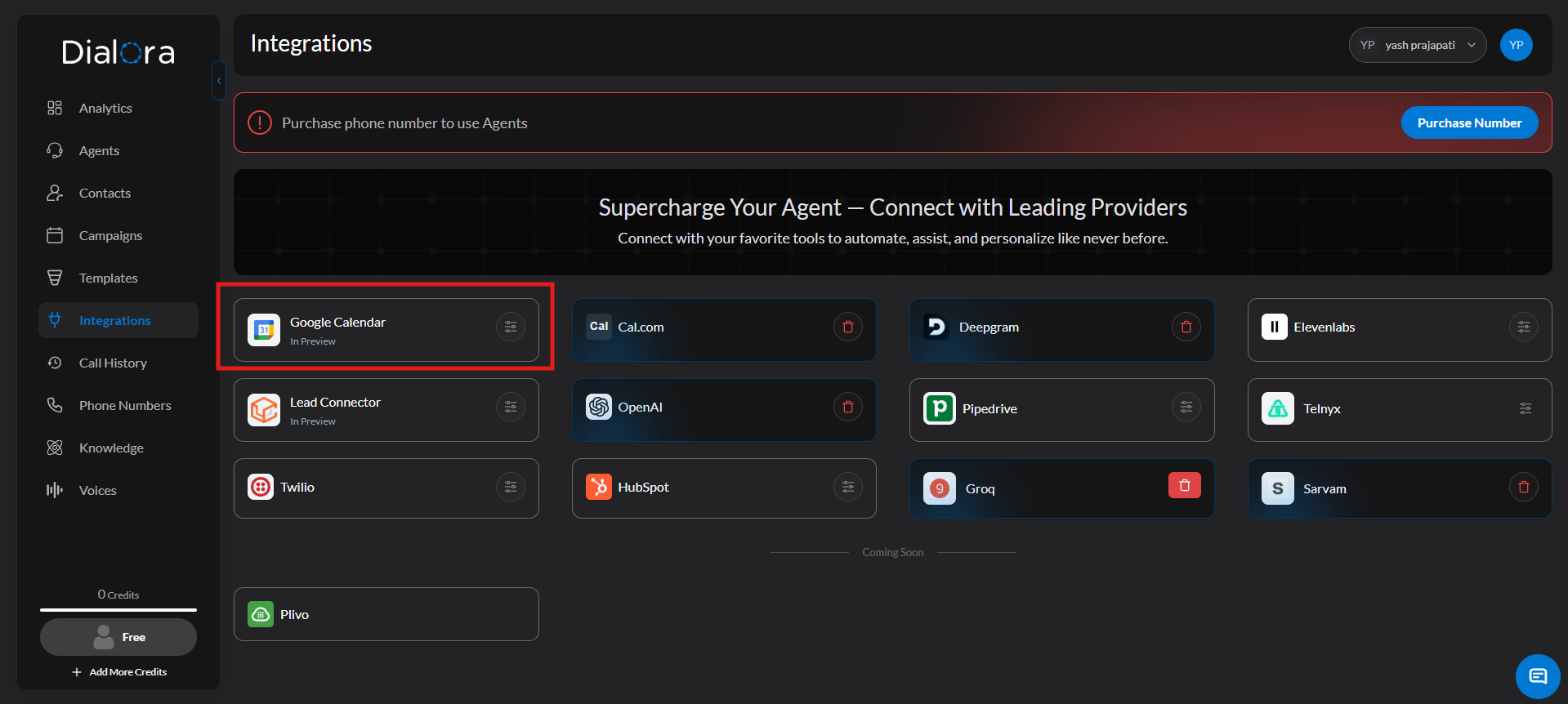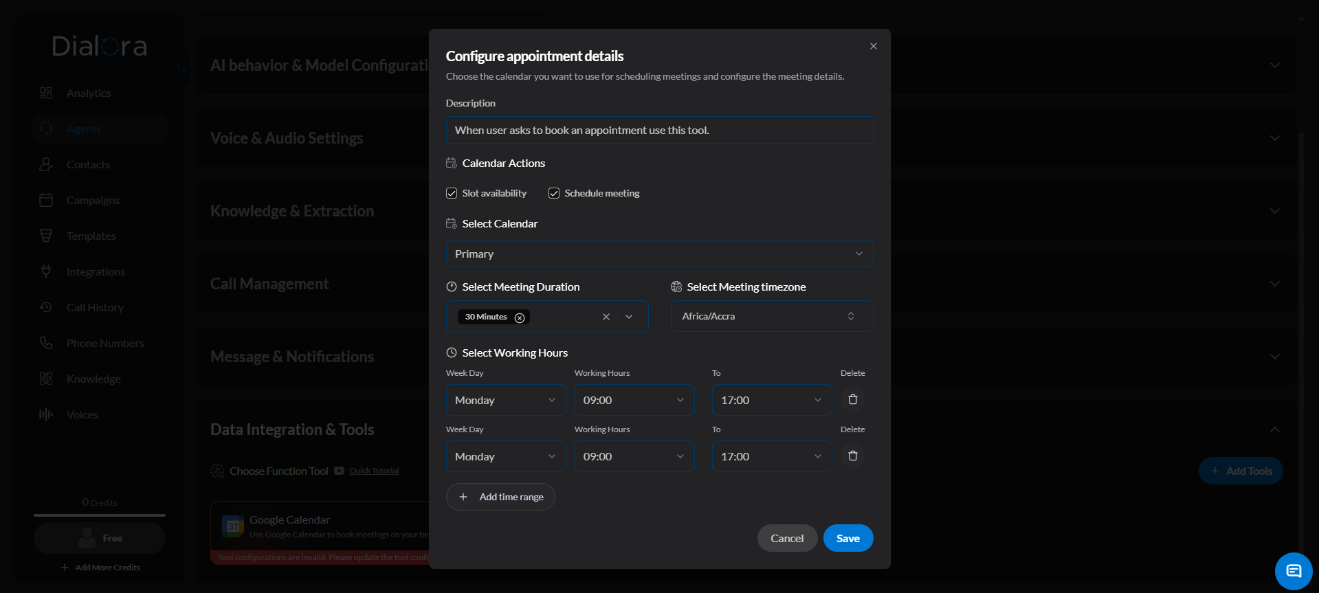 Learn how to integrate Google Calendar with Dialora to manage booking availability and receive call notifications.