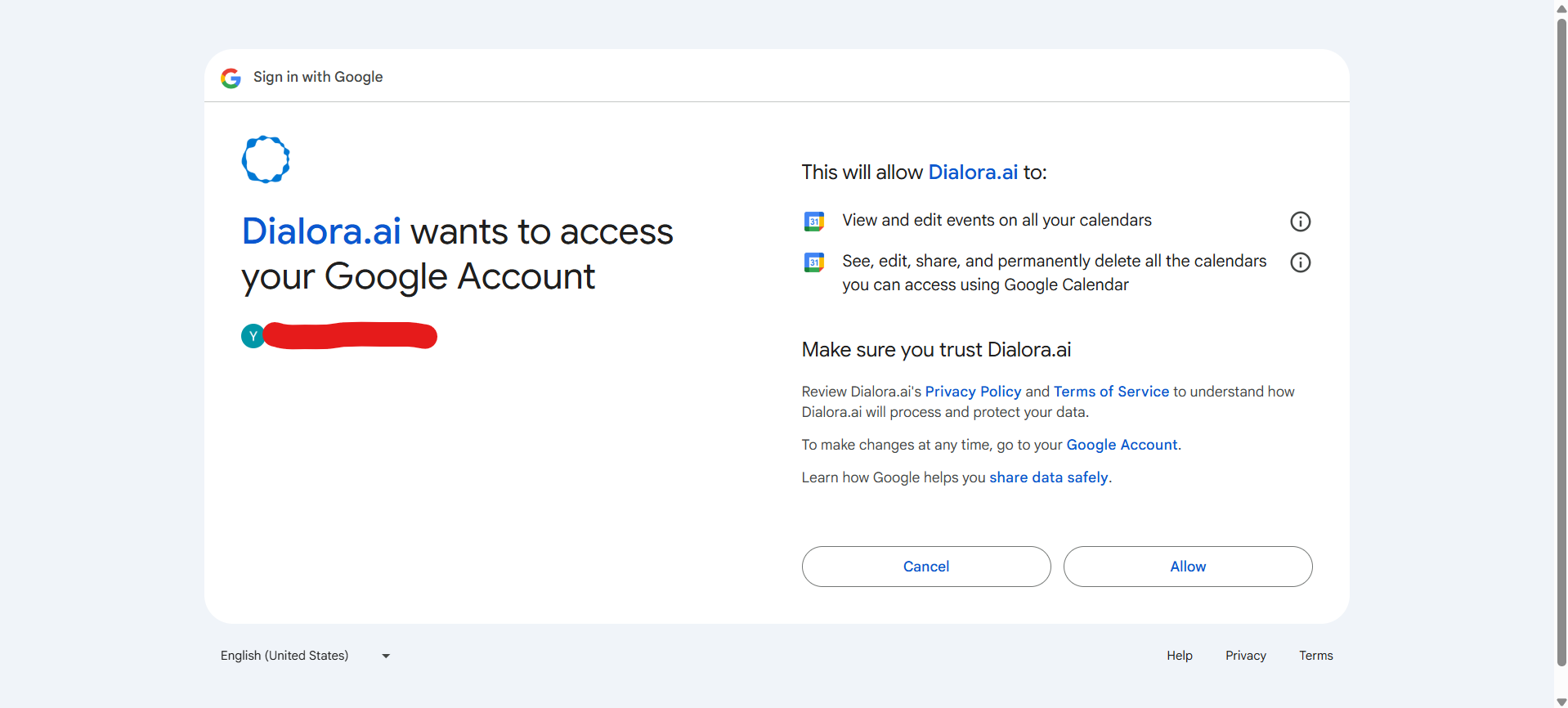 - Click Allow when prompted to grant Dialora access to your calendar.