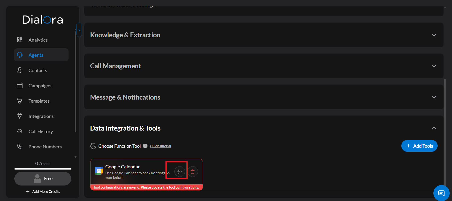 - Navigate to Agents → Advanced Settings → Data Integration & Tools.