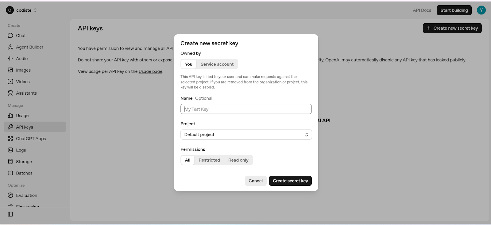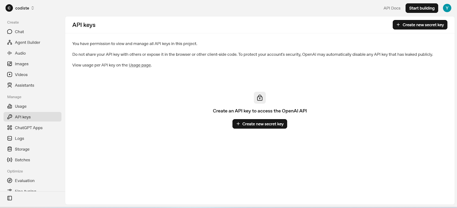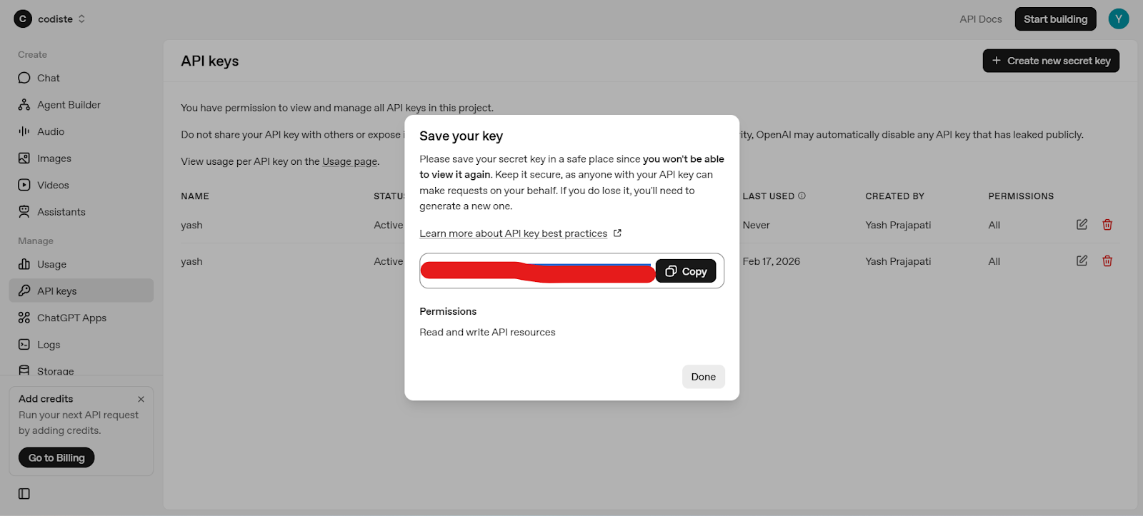 - Make sure to copy it immediately — OpenAI will only show it once.