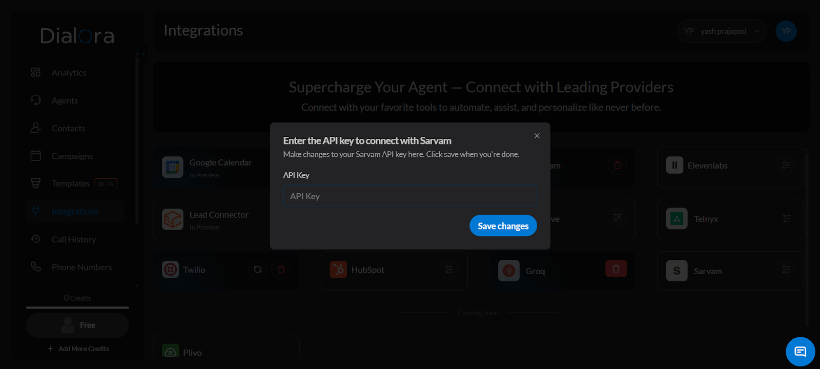 How to Set Up Sarvam API Key Integration with Dialora